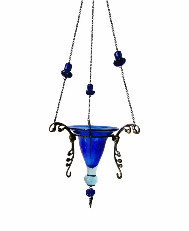Καντήλι χειροποίητο από φυσητό γυαλί ελληνικής κατασκευής. Είναι κρεμαστό και η αλυσίδα του είναι στολισμένη με χάντρες σε ομόχρωμα χρώματα. Είναι διακοσμημένο με μεταλλικό σταυρουδάκι ή αγγελάκι στη βάση του.