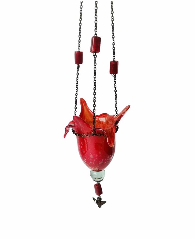 Καντήλι χειροποίητο από φυσητό γυαλί ελληνικής κατασκευής. Είναι κρεμαστό και η αλυσίδα του είναι στολισμένη με χάντρες σε ομόχρωμα χρώματα. Είναι διακοσμημένο με μεταλλικό σταυρουδάκι ή αγγελάκι στη βάση του.