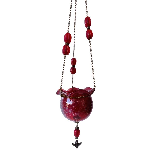 Καντήλι χειροποίητο από φυσητό γυαλί ελληνικής κατασκευής. Είναι κρεμαστό και η αλυσίδα του είναι στολισμένη με χάντρες σε ομόχρωμα χρώματα. Είναι διακοσμημένο με μεταλλικό σταυρουδάκι ή αγγελάκι στη βάση του.