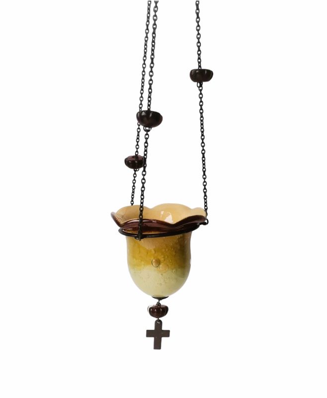 Καντήλι χειροποίητο από φυσητό γυαλί ελληνικής κατασκευής. Είναι κρεμαστό και η αλυσίδα του είναι στολισμένη με χάντρες σε ομόχρωμα χρώματα. Είναι διακοσμημένο με μεταλλικό σταυρουδάκι στη βάση του.