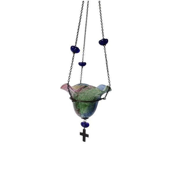 Καντήλι χειροποίητο από φυσητό γυαλί ελληνικής κατασκευής. Είναι κρεμαστό και η αλυσίδα του είναι στολισμένη με χάντρες σε ομόχρωμα χρώματα. Είναι διακοσμημένο με μεταλλικό σταυρουδάκι στη βάση του.