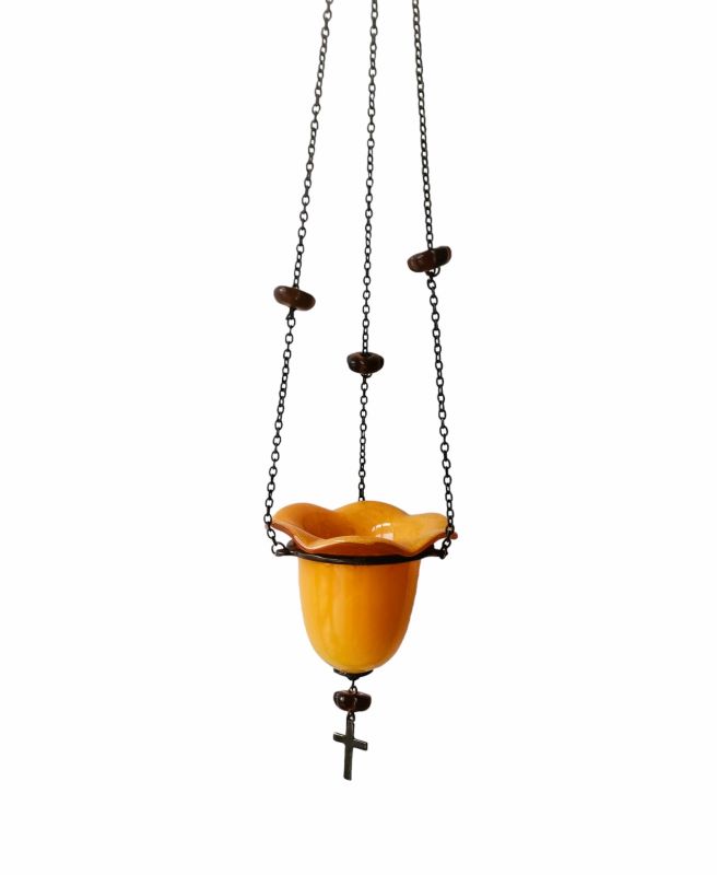 Καντήλι χειροποίητο από φυσητό γυαλί ελληνικής κατασκευής. Είναι κρεμαστό και η αλυσίδα του είναι στολισμένη με χάντρες σε ομόχρωμα χρώματα. Είναι διακοσμημένο με μεταλλικό σταυρουδάκι στη βάση του.