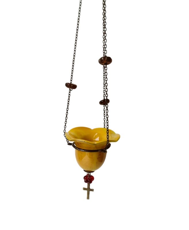 Καντήλι χειροποίητο από φυσητό γυαλί ελληνικής κατασκευής. Είναι κρεμαστό και η αλυσίδα του είναι στολισμένη με χάντρες σε ομόχρωμα χρώματα. Είναι διακοσμημένο με μεταλλικό σταυρουδάκι στη βάση του.
