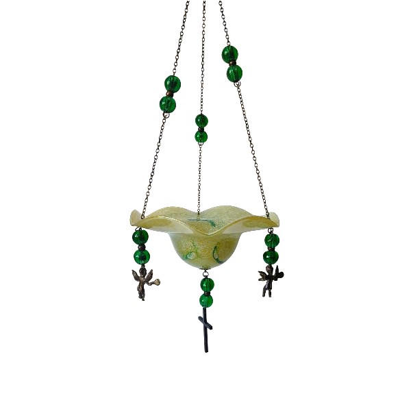 Καντήλι χειροποίητο από φυσητό γυαλί ελληνικής κατασκευής. Είναι κρεμαστό και η αλυσίδα του είναι στολισμένη με χάντρες σε ομόχρωμα χρώματα. Είναι διακοσμημένο με μεταλλικά αγγελάκια και σταυρό στη βάση του.