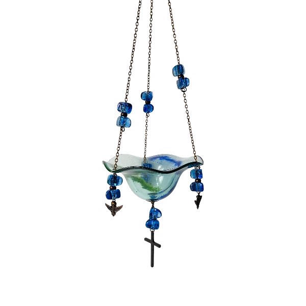 Καντήλι χειροποίητο από φυσητό γυαλί ελληνικής κατασκευής. Είναι κρεμαστό και η αλυσίδα του είναι στολισμένη με χάντρες σε ομόχρωμα χρώματα. Είναι διακοσμημένο με μεταλλικά αγγελάκια και σταυρό στη βάση του.