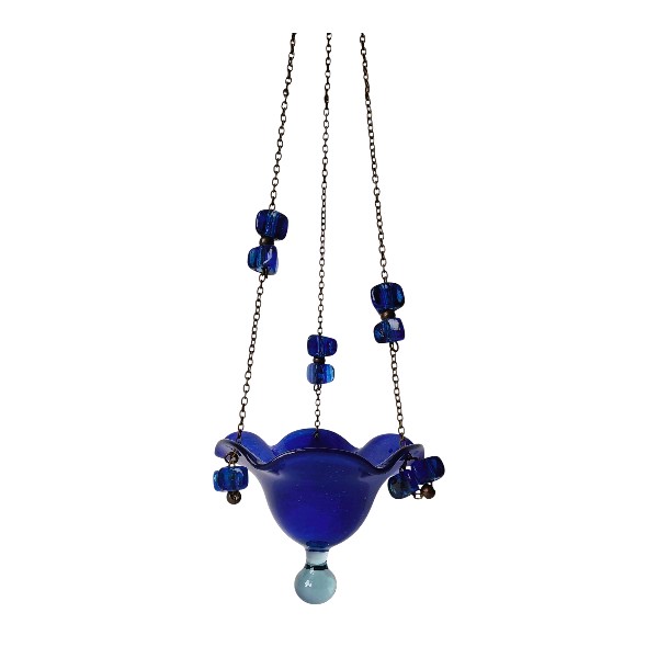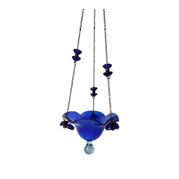 Καντήλι χειροποίητο από φυσητό γυαλί ελληνικής κατασκευής. Είναι κρεμαστό και η αλυσίδα του είναι στολισμένη με χάντρες σε ομόχρωμα χρώματα. Είναι διακοσμημένο με μεταλλικό σταυρουδάκι ή αγγελάκι στη βάση του.