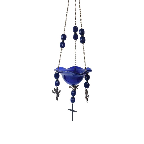 Καντήλι χειροποίητο από φυσητό γυαλί ελληνικής κατασκευής. Είναι κρεμαστό και η αλυσίδα του είναι στολισμένη με χάντρες σε ομόχρωμα χρώματα. Είναι διακοσμημένο με μεταλλικά αγγελάκια και σταυρό στη βάση του.