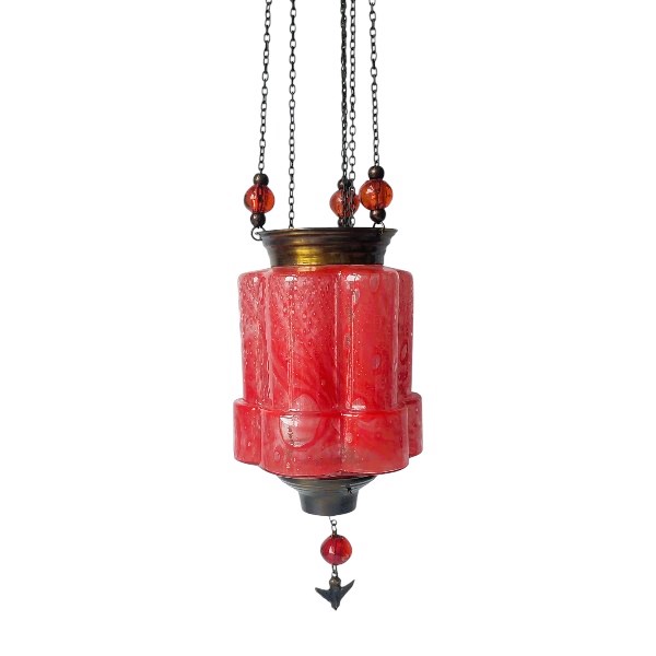 Καντήλι χειροποίητο από φυσητό γυαλί ελληνικής κατασκευής. Είναι κρεμαστό και η αλυσίδα του είναι στολισμένη με χάντρες σε ομόχρωμα χρώματα. Είναι διακοσμημένο με μεταλλικό σταυρουδάκι ή αγγελάκι στη βάση του.