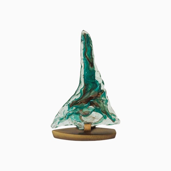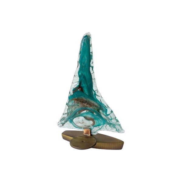 Καράβι επιτραπέζιο από φυσητό γυαλί με μπρούτζινη βάση, χειροποίητο ελληνικής κατασκευής. Από πίσω υπάρχει βάση για να τοποθετηθεί ρεσώ. Διακοσμητικό επιτραπέζιο για να ομορφύνετε κάθε χώρο, δίνοντας έμφαση στις λεπτομέρειες που θα προσθέσουν μία ιδιαίτερη πινελιά. Αποτελεί ιδανική πρόταση για δώρο.