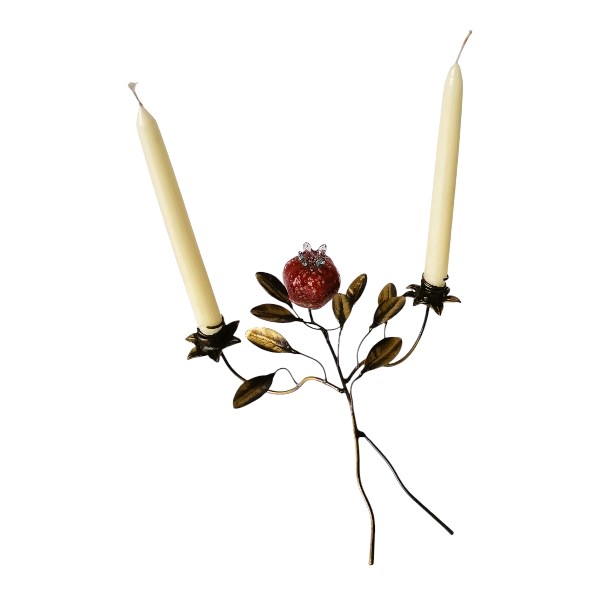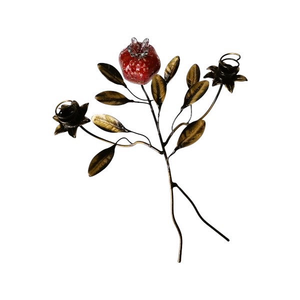 Κηροπήγιο δίκερο μπρούτζινο με ρόδι από φυσητό γυαλί, χειροποίητο ελληνικής κατασκευής. Διακοσμητικό επιτραπέζιο για να ομορφύνετε κάθε χώρο, δίνοντας έμφαση στις λεπτομέρειες που θα προσθέσουν μία ιδιαίτερη πινελιά. Ιδανική πρόταση για δώρο.
