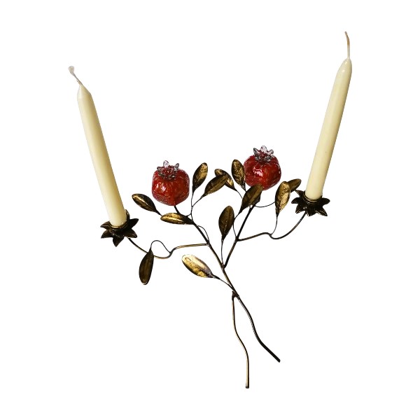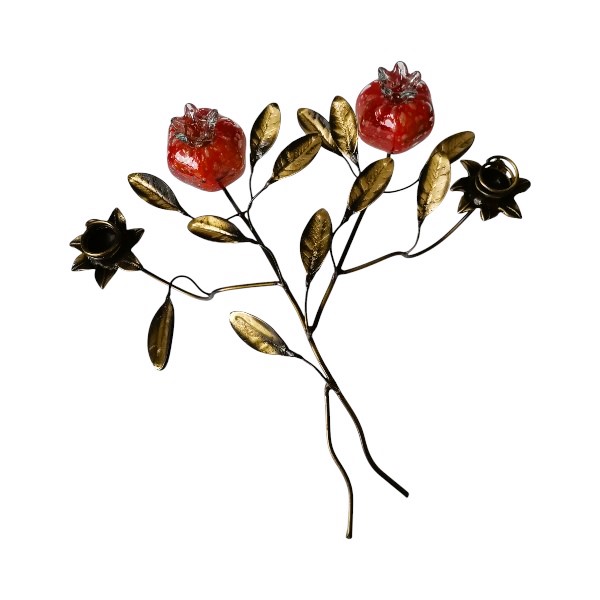 Κηροπήγιο δίκερο μπρούτζινο με ρόδια από φυσητό γυαλί
