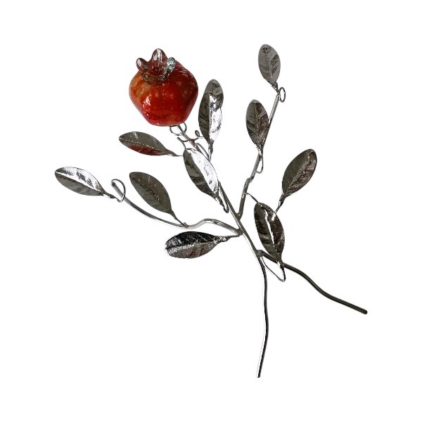 Κλαδί μπρούτζινο νίκελ με ρόδι από φυσητό γυαλί, χειροποίητο ελληνικής κατασκευής. Διακοσμητικό επιτραπέζιο και τοίχου για να ομορφύνετε κάθε χώρο, δίνοντας έμφαση στις λεπτομέρειες που θα προσθέσουν μία ιδιαίτερη πινελιά. Ιδανική πρόταση για δώρο.