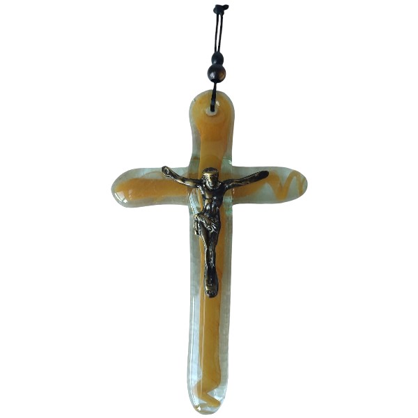 Χειροποίητος σταυρός κρεμαστός από φυσητό γυαλί, σε μελί απόχρωση, ελληνικής κατασκευής. Ένα διαχρονικό κομμάτι για να διακοσμήσετε το σπίτι και τον χώρο σας. Ταιριάζει με τα περισσότερα στυλ διακόσμησης και αποτελεί ιδανική πρόταση για δώρο.